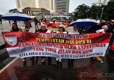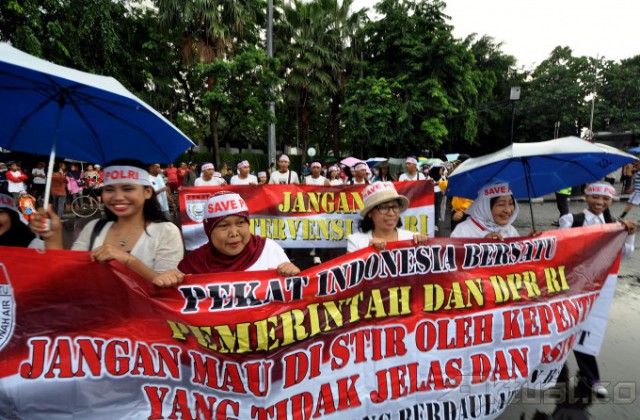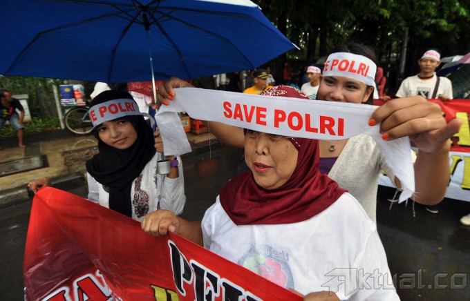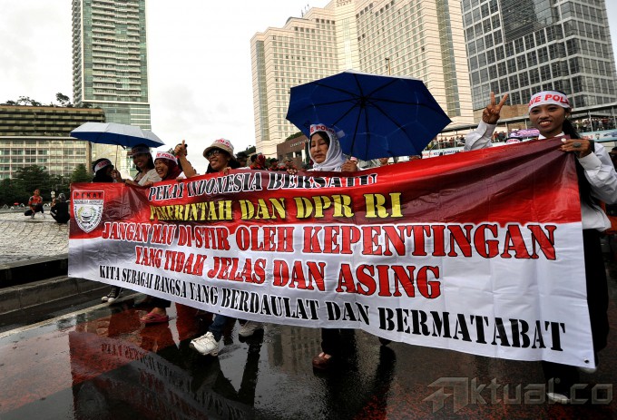 Massa yang tergabung dalam Pekat Indonesai melakukan aksi di Bunderan HI, Jakarta, Minggu (8/2/2105). Dalam aksinya yang mayoritas ibu-ibu yang membawa spanduk dan ikat kepala yang bertuliskan Save Polri dan Pemerintah dan DPR jangan mau di stir oleh kepentingan yang tidak jelas dan asing. AKTUAL/MUNZIR