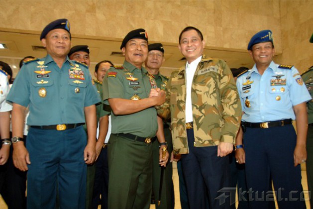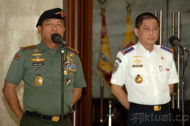 Panglima TNI Jenderal Moeldoko dan Menteri Perhubungan RI Ignasius Jonan melakukan penandatangaan Memorandum Of Understanding (MoU) antara Tentara Nasional Indonesia (TNI) dengan Kementerian Perhubungan RI terkait pengamanan objek vital, di Mabes TNI Cilangkap Jakarta Timur, Jumat (20/2/2015). Kerjasama ini natinya personel TNI akan diperbantukan ke bandara, pelabuhan serta obyek transportasi di bawah Kementerian Perhubungan untuk pengamanan objek vital. Personel TNI yang akan diperbantukan adalah personel yang akan memasuki masa pensiun sekaligus untuk magang dalam masa MPP (Masa Persiapan Pensiun). AKTUAL/PUSPEN TNI