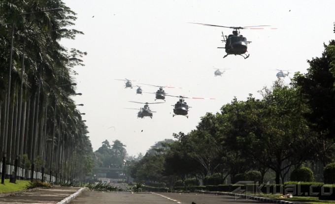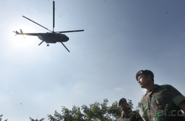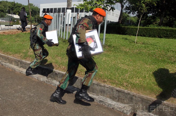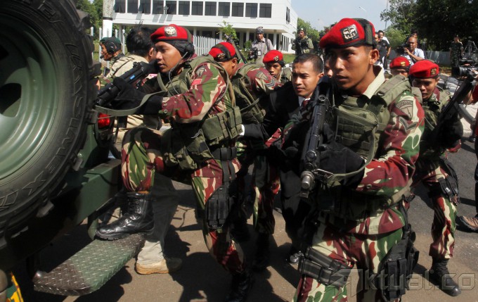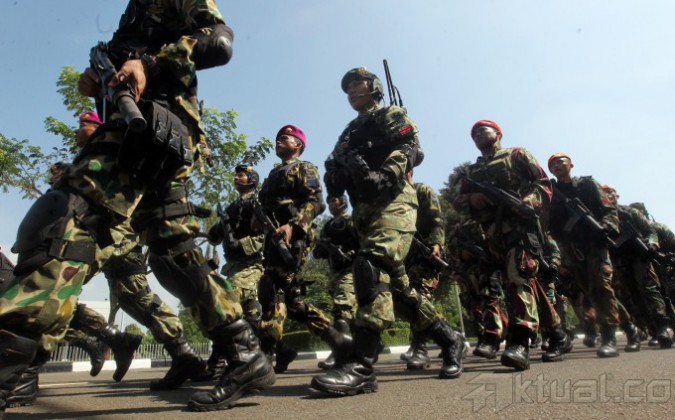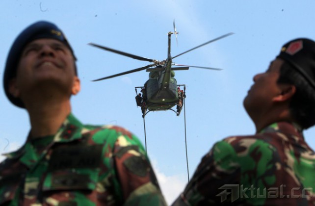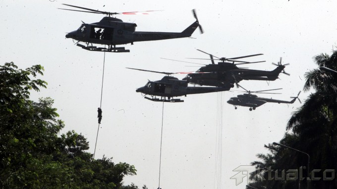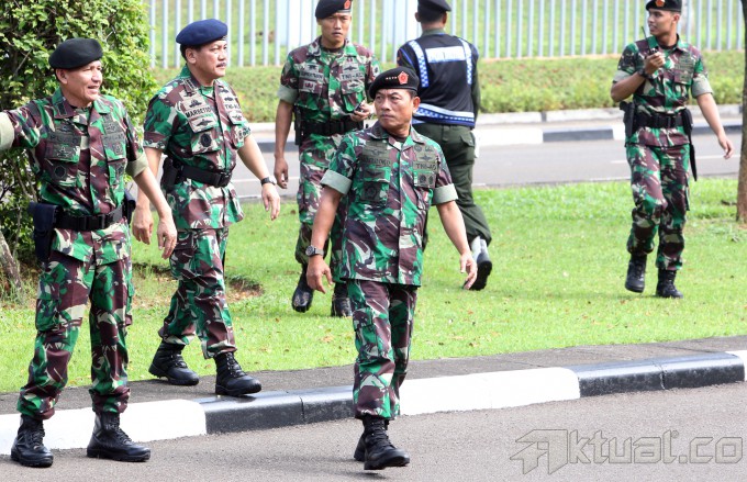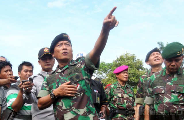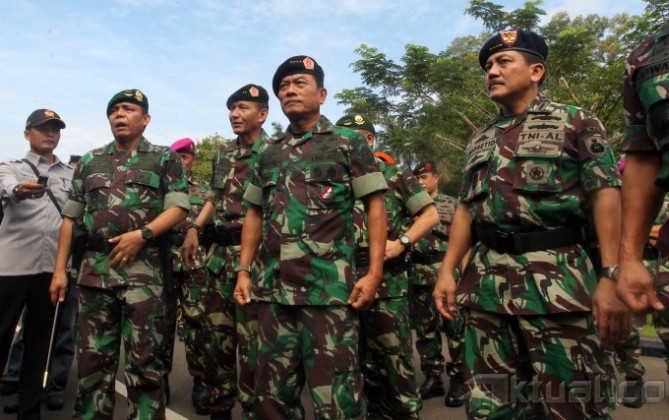 Panglima TNI Jenderal Moeldoko memantau latihan pasukan khusus pengamanan pengumuman pilpres 2014 di Mabes TNI AD, Cilangkap, Jakarta Timur, Jumat (18/7/2014). Sebanyak 64 personel pasukan khusus TNI dari satuan penanggulangan teroris, yang terdiri atas Kostrad dan Kopassus TNI Angkatan Darat, Marinir TNI Angkatan Laut dan Paskhas TNI Angkatan Udara, melakukan latihan pengamanan menjelang rekapitulasi suara secara nasional pada 22 Juli 2014. Aktual/Tino Oktaviano
