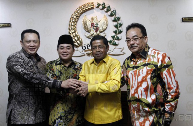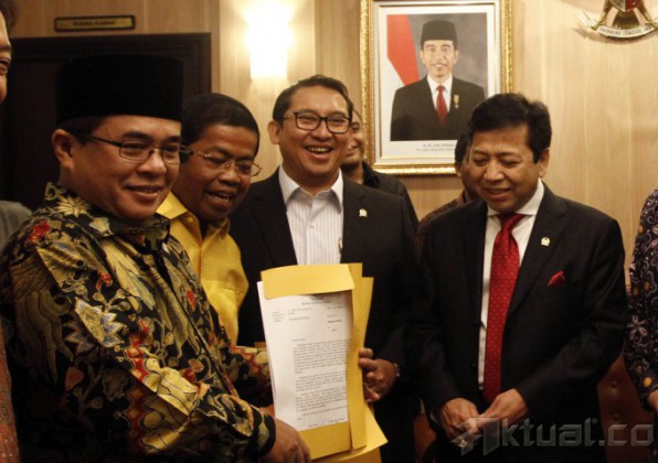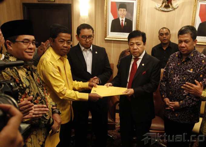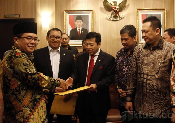 Sekjen Golkar Munas Bali, Idrus Marham menyerahkan putusan sela PTUN kepada Ketua DPR Setya Novanto di DPR RI, Senayan, Jakarta, Kamis (2/4/2015). Pengadilan Tata Usaha Negara (PTUN) memerintahkan Menkum HAM menunda berlakunya SK pengesahan kepengurusan DPP Golkar Agung Laksono. Penetapan dalam putusan sela itu diteruskan kubu Aburizal Bakrie ke pimpinan DPR. AKTUAL/JUNAIDI MAHBUB