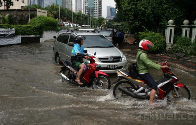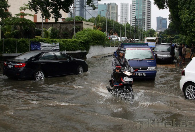 Sejumlah kendaraan melintasi jalanan yang tergenang air di kawasan Jalan Gatot Subroto, Jakarta, Minggu (12/1/2014). Akibat hujan dengan intensitas sedang hingga deras yang terjadi di seluruh wilayah Jakarta sejak pagi mengakibatkan sejumlah ruas jalan di Ibu kota tergenang air. Alhasil, kemacetan lalu lintas pun tak bisa dihindari. Aktual/Tino Oktaviano