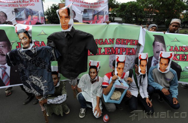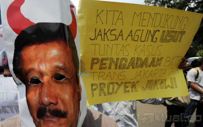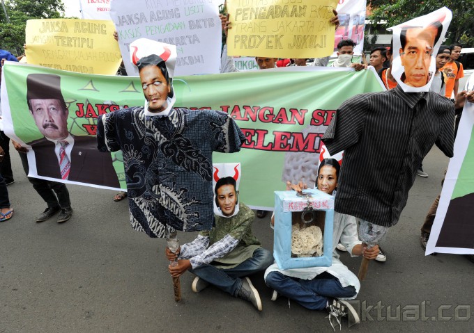 Himpunan Mahasiswa Islam (HMI) berdemo di depan Kejaksaan Agung (Kejagung) Jakarta Selatan, Rabu (2/4/2014). Mereka mendesak Jaksa Agung mengusut dugaan keterlibatan Jokowi dalam kasus dugaan korupsi bus TransJakarta karatan. Aktual/Tino Oktaviano