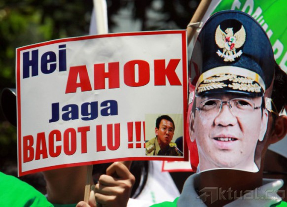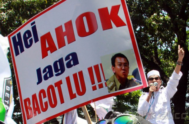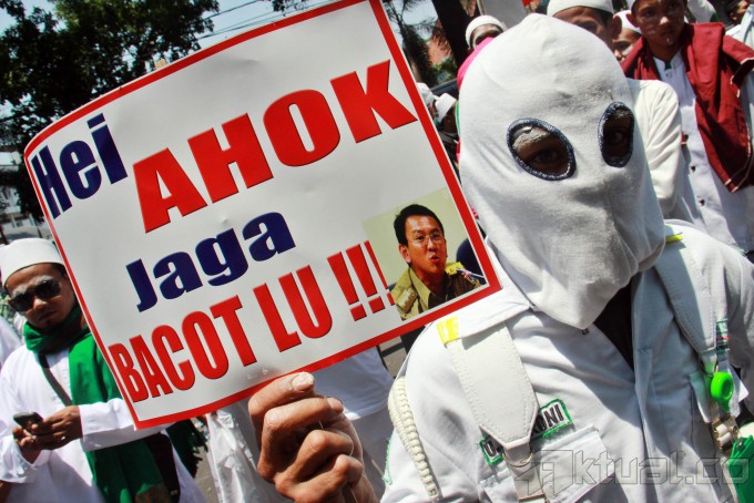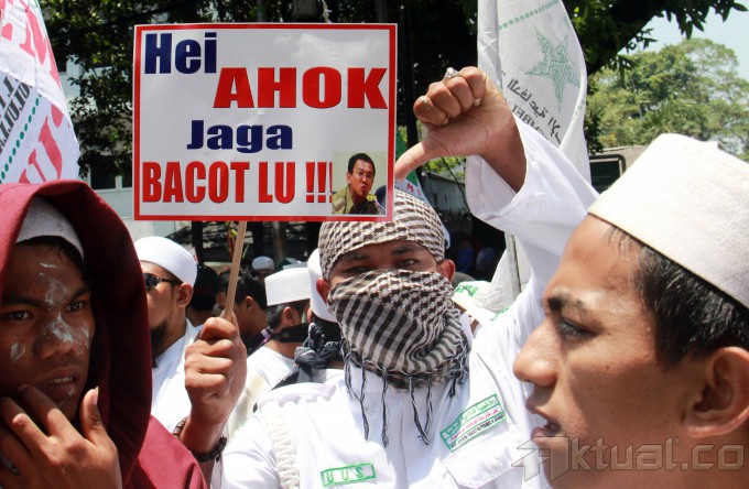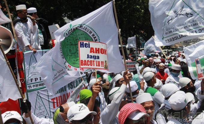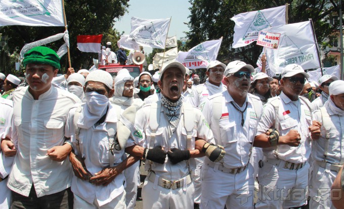Massa dari Front Pembela Islam berunjuk rasa di depan Gedung DPRD DKI Jakarta, Rabu (24/9/2014). Dalam aksinya mereka menolak Basuki Tjahja Purnama (Ahok) menjadi Gubernur DKI Jakarta. AKTUAL/TINO OKTAVIANO