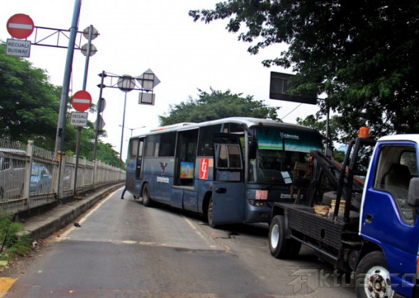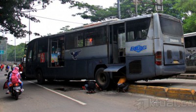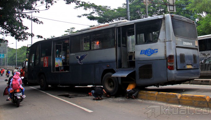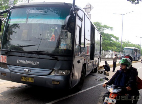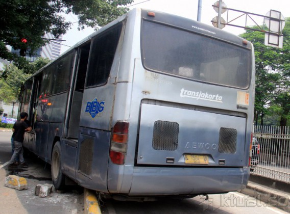 Teknisi Bus Transjakarta berusaha mengevakuasi bus Transjakarta koridor Ragunan-Dukuh Atas yang tersangkut pada pembatas jalur busway di Jalan Galunggung, Dukuh Atas I, Jakarta, Minggu (12/4/2015). Kecelakaan yang diduga akibat sopir mengantuk ini mengakibatkan tertutupnya jalur busway. AKTUAL/MUNZIR