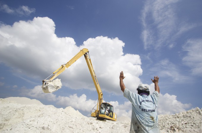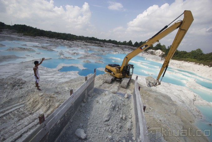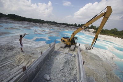 Pekerja dari PT Aneka Kaoline Utama melakukan aktivitas penambangan kaoline di Belitung Barat, Rabu (25/3). Minimnya ketersediaan kaolin sebagai bahan baku untuk industri keramik menjadi hambatan peningkatan ekspor keramik. ANTARA FOTO/Vitalis Yogi Trisna