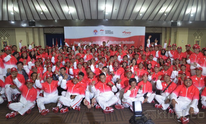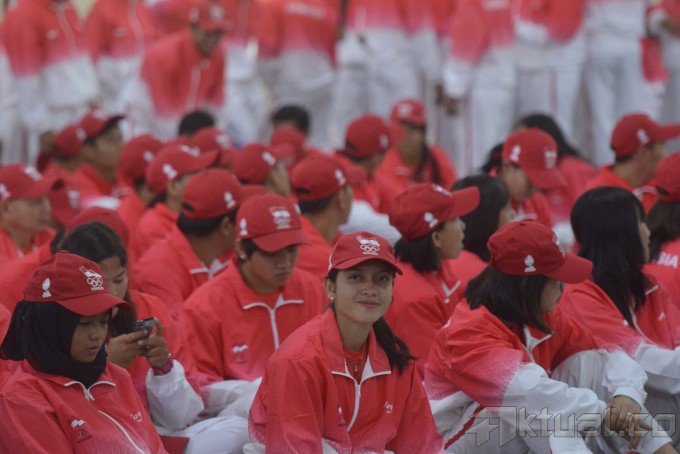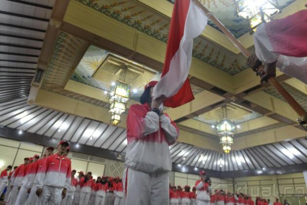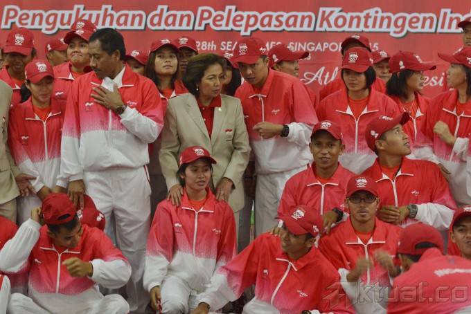 Seorang atlet mencium bendera merah putih disaksikan Ketua Komite Olimpiade Indonesia (KOI) Rita Subowo (kanan) ketika mengikuti pengukuhan dan pelepasan kontingen Sea Games ke-28 Singapura, di Jakarta, Senin (25/5). Kontingen Indonesia berjumlah 522 atlet akan terjun dalam 32 cabang pada pesta olahraga se-Asia Tenggara yang berlangsung pada 5-16 Juni mendatang. ANTARA FOTO/Wahyu Putro A
