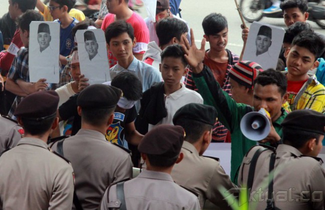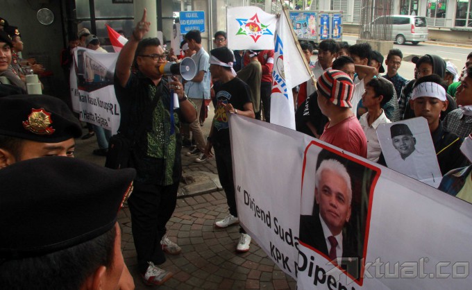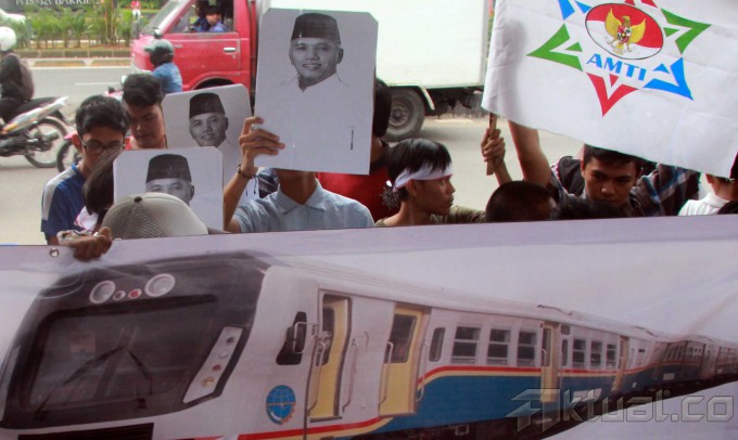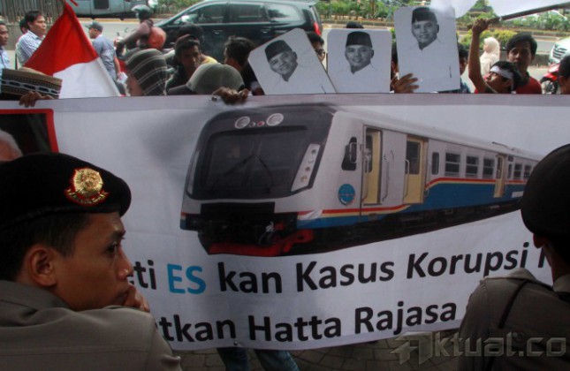 Sejumlah orang yang tergabung dalam Aliansi Masyarakat Transportasi Indonesia (AMTI) berujuk rasa kasus korupsi gerbong di gedung Komisi Pemberantasan Korupsi (KPK), Jakarta, Jumat (27/6/2014). Mereka meminta KPK memeriksa Hatta Rajasa yang saat menjabat Menteri Perhubungan masa bakti 2004-2007 untuk segera disidik dalam perkara korupsi hibah gerbong kereta api listrik bekas Jepang. Aktual/Tino Oktaviano