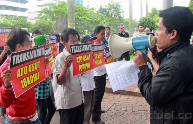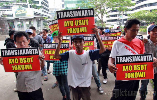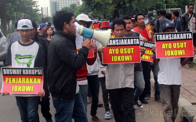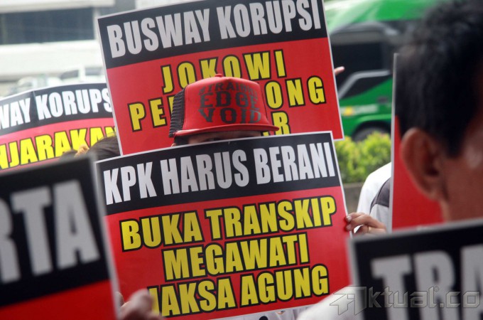 Massa yang tergabung dalam Persatuan Mahasiswa Jakarta (Permata DKI Jakarta) menggelar aksi didepan Gedung KPK, Jakarta, Jumat (27/6/2014). Mereka meminta KPK mengambil alih dugaan korupsi bus tranjakarta yang kini ditangani Kejaksan Agung yang diduga melibatkan Gubernur non aktif Joko Widodo. Aktual/Tino Oktaviano