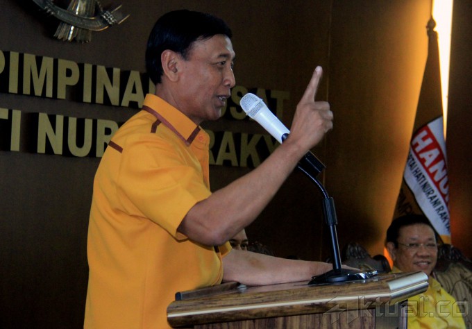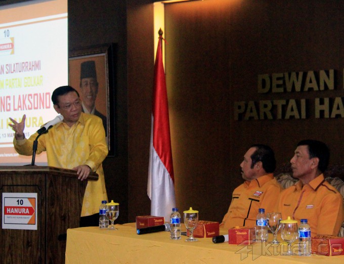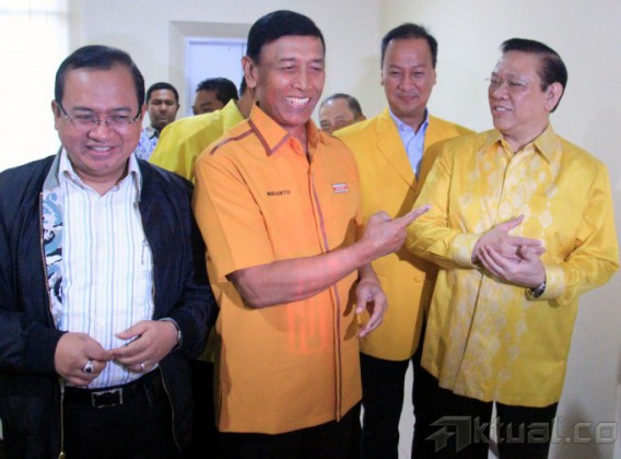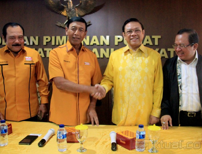 Ketua Umum Partai Golkar versi Munas Ancol Agung Laksono dan Ketua Umum Partai HANURA Wiranto saat bertemu di kantor DPP Partai Hanura, Jalan Tanjung Karang, Jakarta Pusat, Jumat (13/3/2015). Dalam pertemuan yang mengagendakan Silahturahmi lintas Partai Politik. AKTUAL/MUNZIR