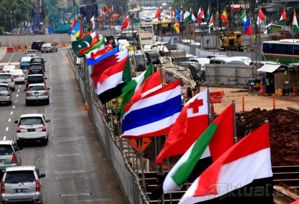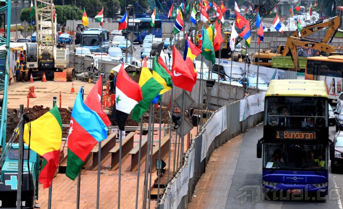Deretan bendera negara peserta Konferensi Asia Afrika ke-60 terpasang di dinding proyek MRT kawasan Bundaran HI, Jakarta, Rabu (15/4/2015). Persiapan ini dilakukan di sepanjang jalur yang dilalui peserta negara KAA ke-60 yang akan dilaksanakan dari 19 – 24 April mendatang. AKTUAL/TINO OKTAVIANO