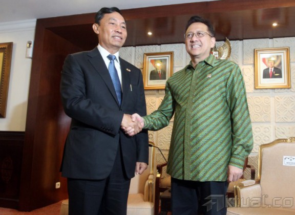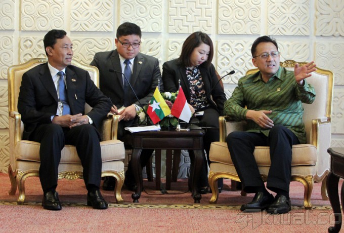 Ketua DPD RI Irman Gusman (kanan) menerima Ketua Delegasi Parlemen Myanmar Thura U Shwe Mann (kiri) saat berkunjung di Gedung Parlemen, Jakarta, Rabu (18/12/2013). Kunjungan Parlemen Myanmar untuk membahas kerjasama antar parlemen di bidang politik, ekonomi dan budaya. Aktual/Tino Oktaviano