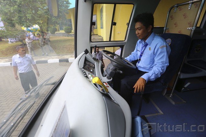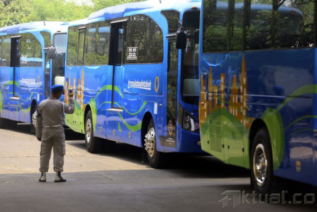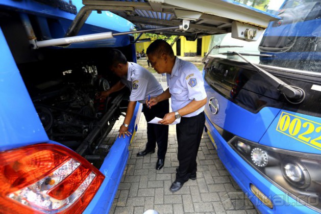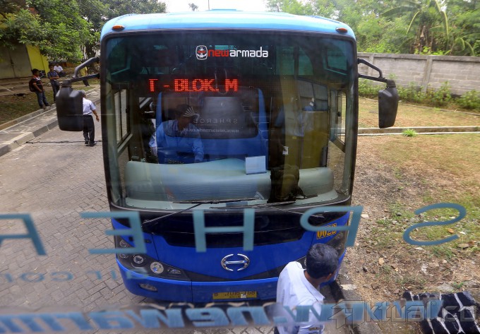 Deretan bus baru PPD rute Ciputat-Blok M yang akan beroperasi, di pool perusahaan Pengangkutan Penumpang Djakarta (PPD) Transjabodetabek, Ciputat, Tangerang Selatan, Kamis (2/10/2014). Mulai hari ini hingga seminggu ke depan, bus baru PPD rute Ciputat-Blok M digratiskan bagi para penumpang. Dan untuk berikutnya para penumpang akan dikenakan tarif sebesar Rp 7.000 sekali jalan. AKTUAL/TINO OKTAVIANO