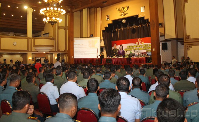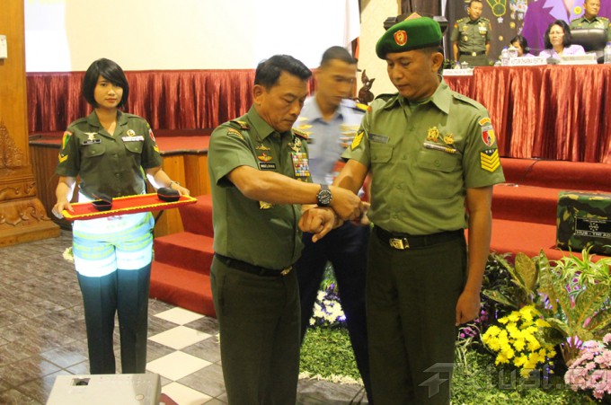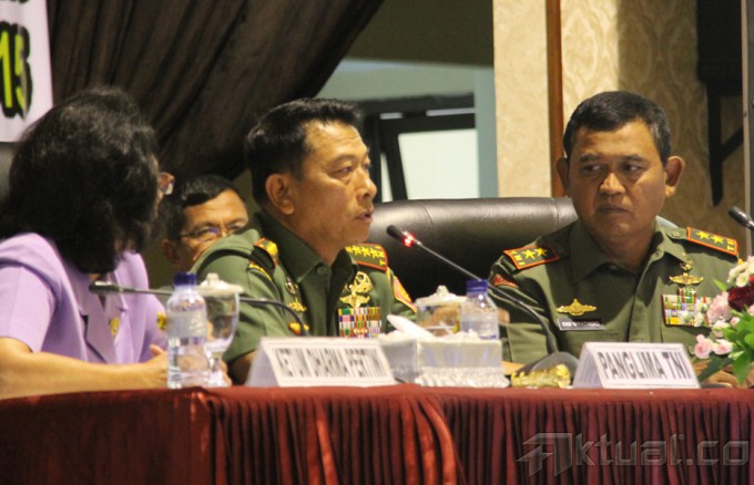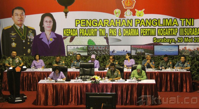 Panglima TNI Jenderal Moeldoko didampingi Pangdam V/Brawijaya Mayjen TNI Eko Wiratmoko memberikan pengarahan kepada 1.380 Prajurit TNI (Angkatan Darat, Angkatan Laut dan Angkatan Udara) dan PNS TNI serta Dharma Pertiwi Kogartap III/Surabaya, di Balai Prajurit Kodam V/Brawijaya, Surabaya, Jawa Timur, Jumat (29/5/2015). Panglima TNI menyampaikan bahwa soliditas itu tidak hanya sebagai visi, akan tetapi sudah menjadi kehidupan kita (TNI). AKTUAL/PUSPEN TNI