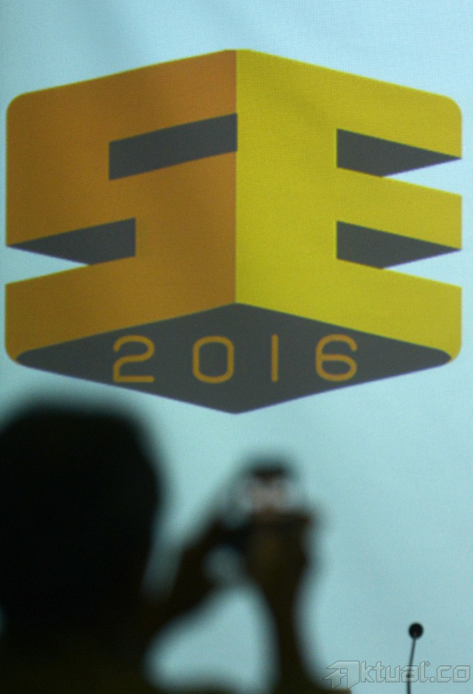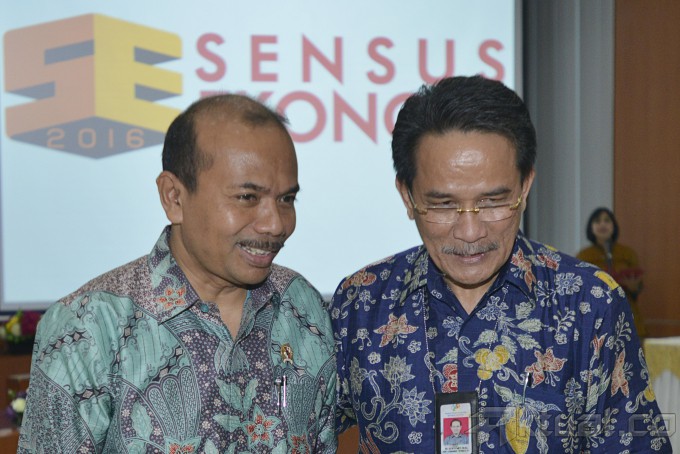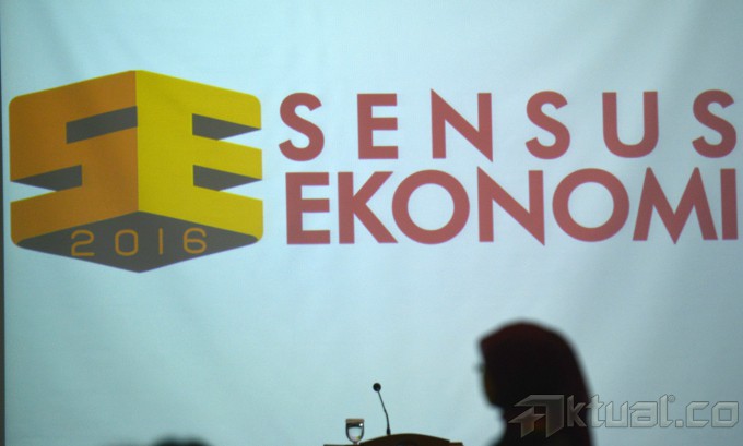 Seorang peserta melintasi logo sensus ekonomi 2016 ketika peluncuran di Kantor BPS Jakarta, Jumat (8/5). BPS akan melakukan sensus ekonomi dengan mendata seluruh sektor usaha secara menyeluruh di 34 provinsi untuk mendapatkan informasi utuh perekonomian sebagai landasan penyusunan kebijakan dan perencanaan pembangunan nasional maupun regional. ANTARA FOTO/Wahyu Putro A