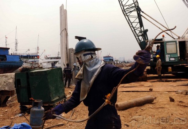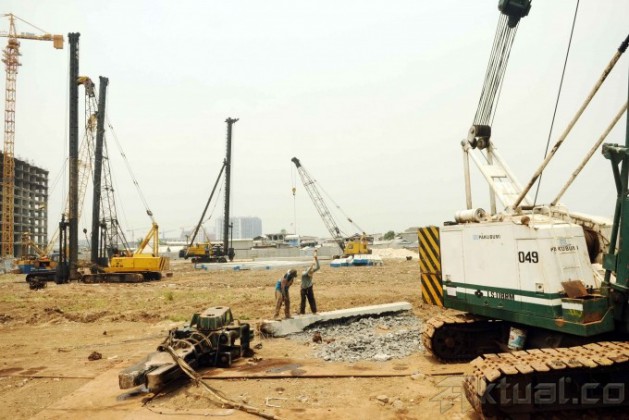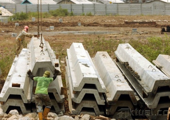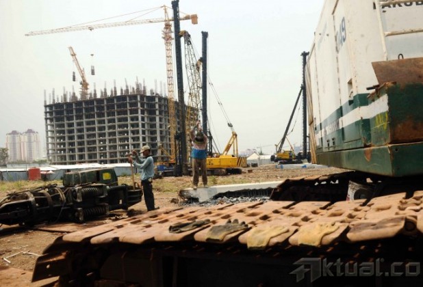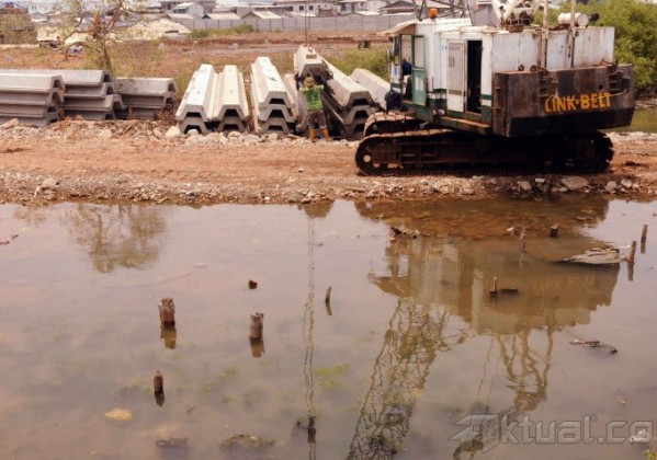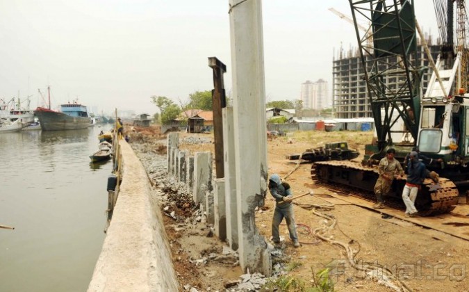 Pekerja perbaiki tanggul yang jebol di kawasan Muara Baru, Jakarta Utara, Minggu (27/10/2013). Dinas Pekerjaan Umum DKI Jakarta memperbaiki tanggul yang rencananya memiliki tinggi empat meter dan panjang 1,1 kilometer. Tanggul baru ini diharapkan bisa menahan luapan air laut pasang yang menyebabkan banjir rob di kawasan ini. Target renovasi ini katanya akan rampung pada akhir Desember 2013. Aktual/Tino Oktaviano