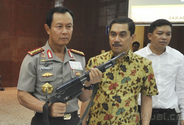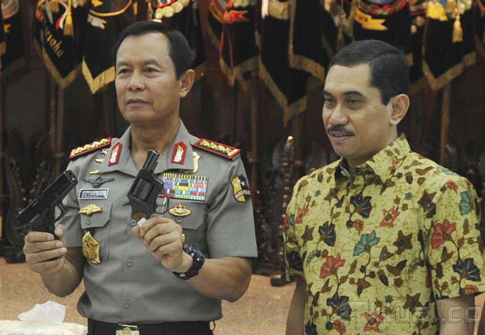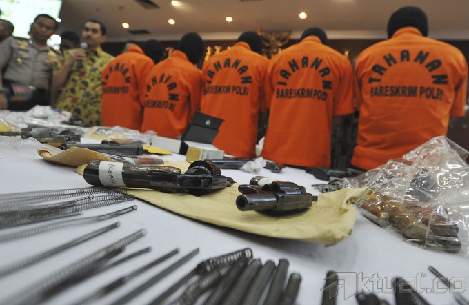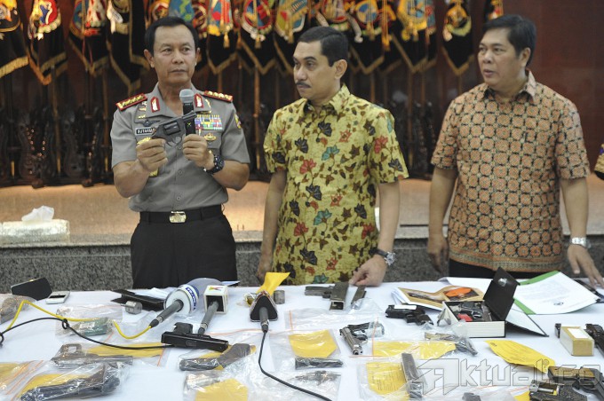 Kapolri Jenderal Pol Sutarman menunjukkan barang bukti senjata api rakitan ilegal saat rilis di Mabes Polri, Jakarta, Jumat (7/11/2014). Bareskrim Mabes Polri berhasil mengungkap 14 bengkel pembuatan senjata api ilegal di wilayah Cipacing, Sumedang, Jawa Barat, dalam sebuah operasi yang berlangsung selama satu bulan. AKTUAL/TINO OKTAVIANO