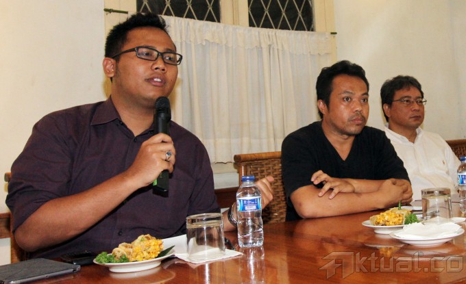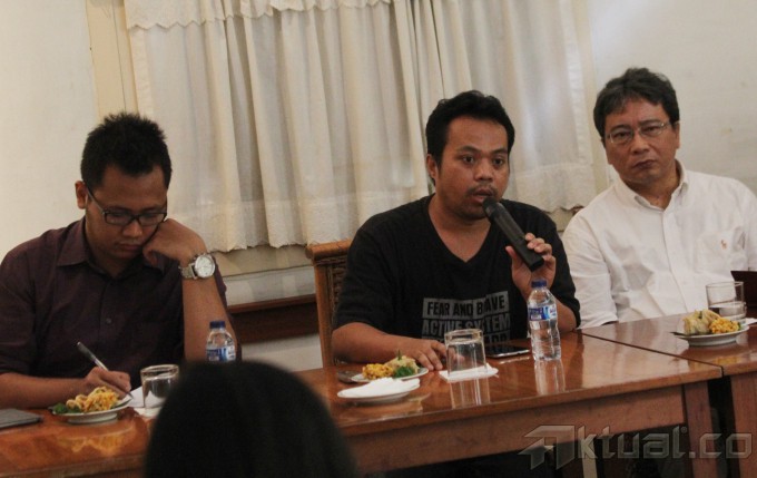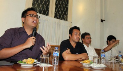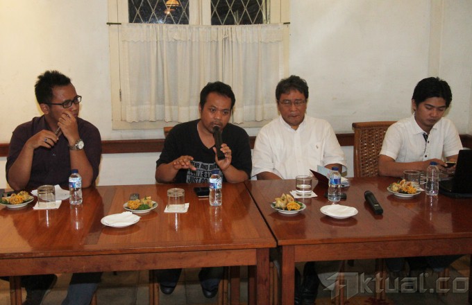 Koordinator divisi investigasi ICW Tama Satrya Langkun, Wakil direktur Lembaga Studi dan Advokasi Masyarakat (Institute for Policy Research and Advocacy) (ELSAM) wahyu wagiman, Guru besar ui Bambang Laksmono dan Manajer kampanye walhi kurniawan saat menjadi pembicara dalam diskusi dengan tema pekerjaan rumah menteri pertanian era Pemerintahan Jokowi-jusuf Kalla di Jakarta, Minggu (02/11). Dalam diskusi tersebut membahas Kabinet Kerja Presiden Joko Widodo jangan sampai melupakan masalah pertanian, yang sampai saat ini belum terselesaikan. AKTUAL/TINO OKTAVIANO
