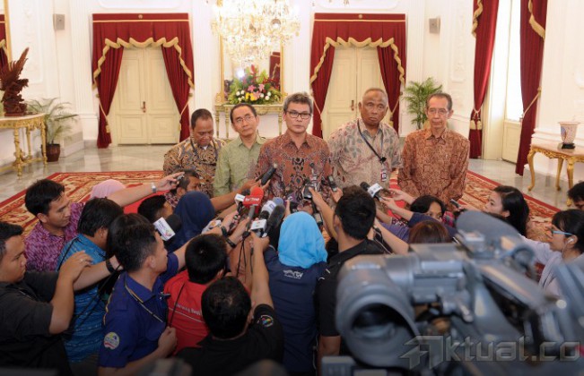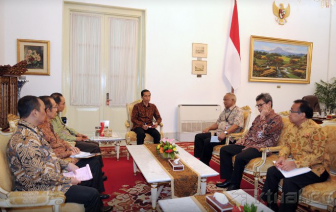 Presiden Joko Widodo (kiri) bersalaman dengan Plt Wakil Ketua KPK Johan Budi (kanan) di Istana Merdeka, Jakarta (27/2). ANTARA FOTO/Setpres-Rusman