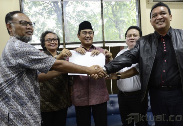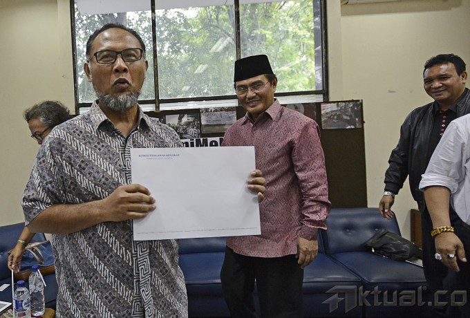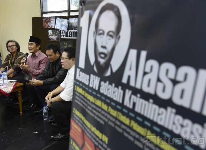 Wakil Ketua nonaktif KPK Bambang Widjojanto atau BW (kedua kiri) bersiap menerima hasil penyidikan dari Ketua Bidang Pembelaan Profesi Perhimpunan Advokat Indonesia (Peradi) Hendrik Jehaman (kanan) disaksikan anggota Tim 9 Jimly Asshiddiqie (kiri) dan Komisi Pengawas Peradi Timbang Pangaribuan di YLBHI, Jakarta Pusat, Jumat (15/5). Komisi Pengawas Peradi menyatakan Bambang Widjojanto tidak terbukti melanggar kode etik advokat. ANTARA FOTO/Fanny Octavianus