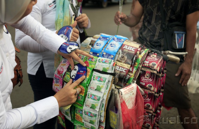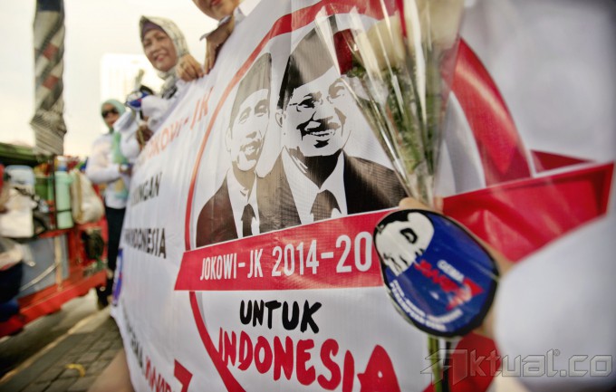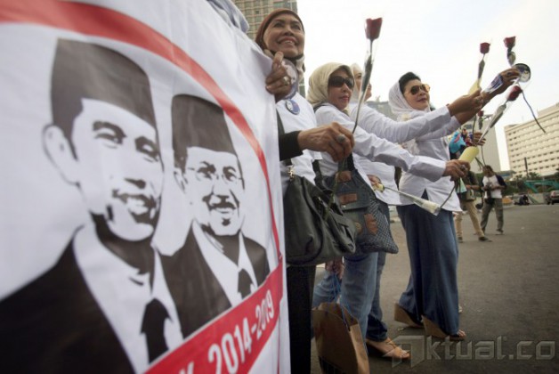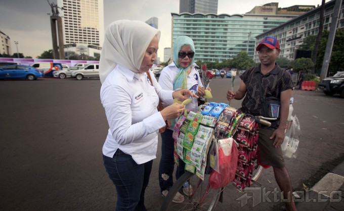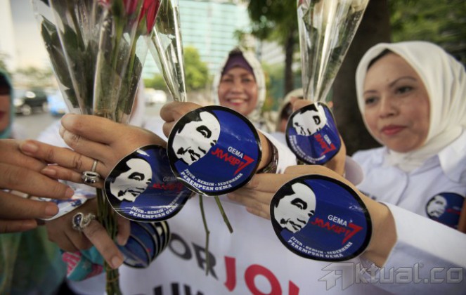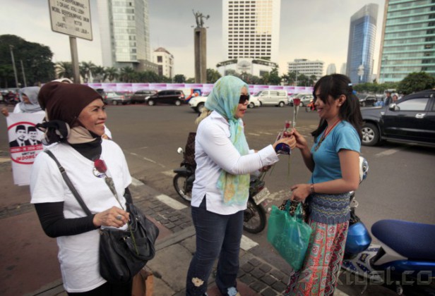 Sejumlah perempuan yang tegabung dalam Anggota Perempuan Gerakan Masyarakat Jokowi for President 7 (Gema JKW4P7), mebagikan bunga saat aksi damai untuk dukungan terhadap pasangan Joko Widodo – Jusuf Kalla di kawasan Bundaran Hotel Indonesia, Jakarta, Jumat (30/5/2014). Mereka mengajak masyarakat untuk memiluh pemimpin yang jujur, bersih dan sederhana. Aktual/Tino Oktaviano