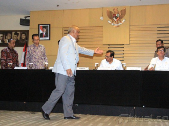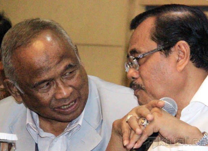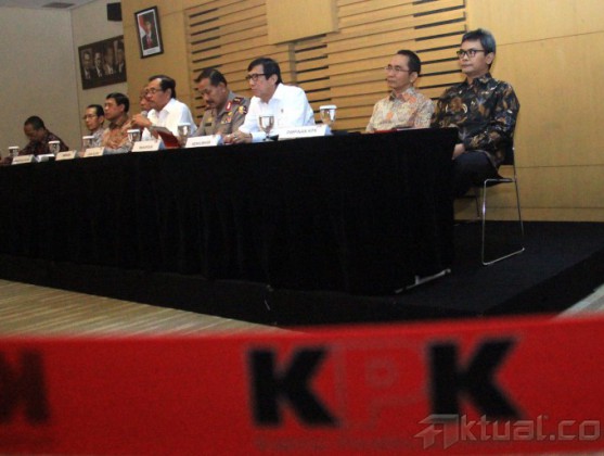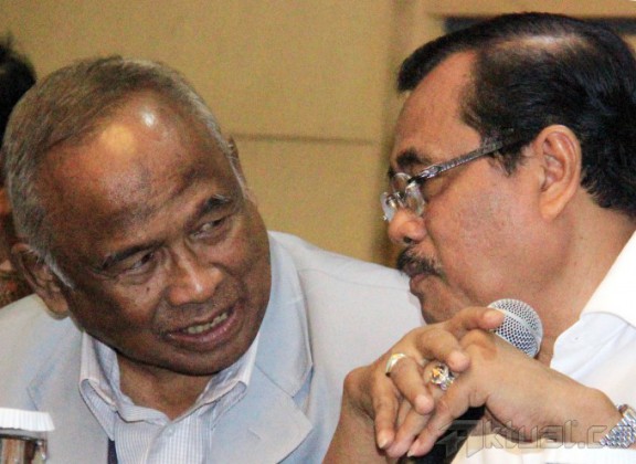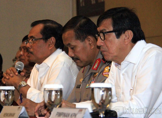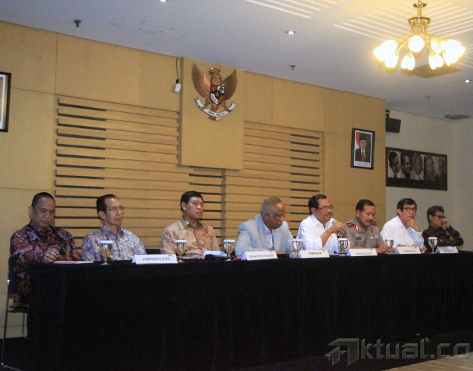 Plt Ketua Komisi Pemberantasan Korupsi (KPK) Taufiequrachman Ruki berbincang dengan Jaksa Agung HM. Prasetyo saat jumpa pers di gedung KPK, Jakarta, Senin (2/3/2015). KPK resmi melimpahkan perkara Komjen Pol Budi Gunawan ke Kejaksaan Agung. AKTUAL/MUNZIR