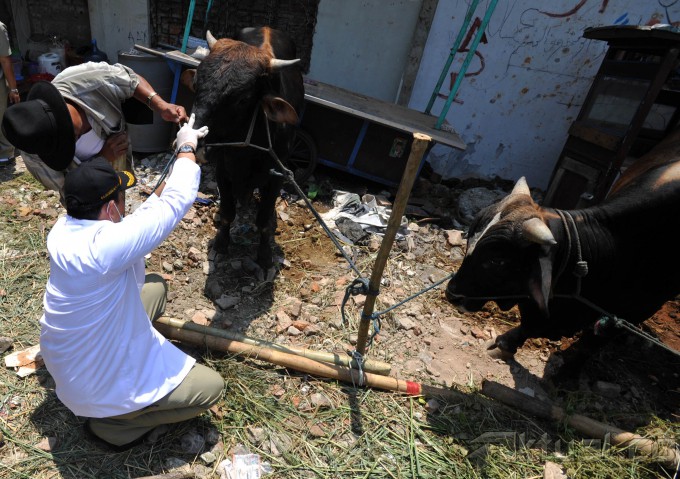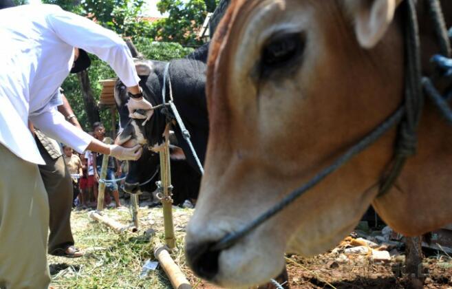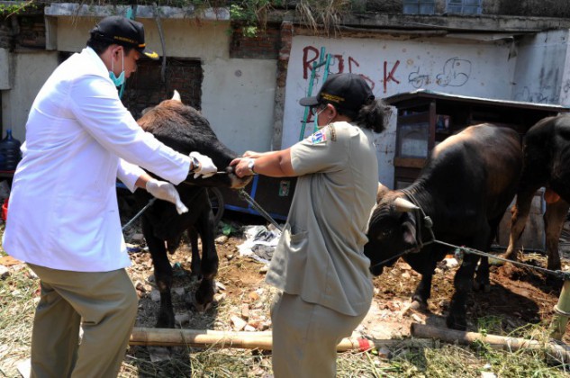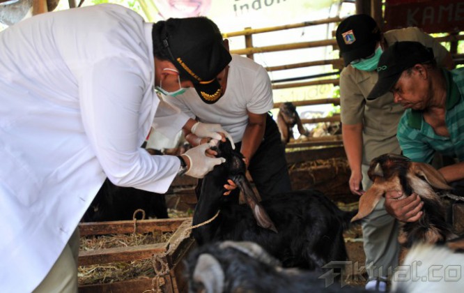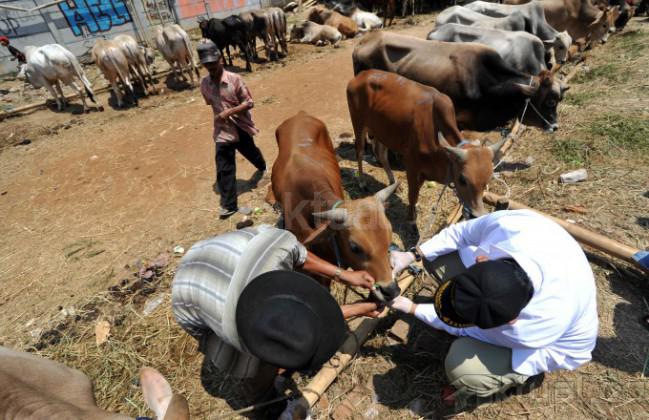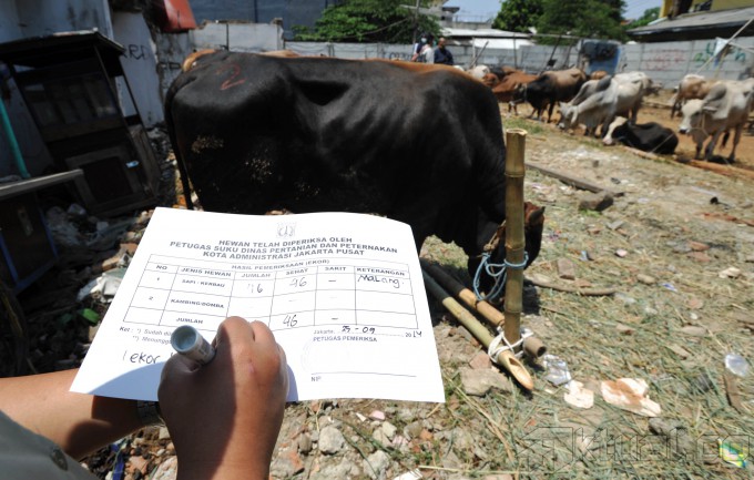 Dokter hewan dari Sudin Pertanian & Peternakan Jakarta Pusat melakukan pemeriksaan terhadap hewan kurban yang dijual pedagang di kawasan Tanah Abang, Jakarta, Rabu (24/9/2014). Pemeriksaan dilakukan untuk melindungi konsumen dari hewan kurban yang sakit ataupun belum cukup umur. AKTUAL/TINO OKTAVIANO