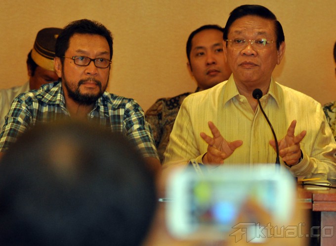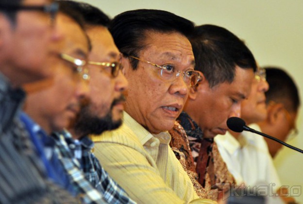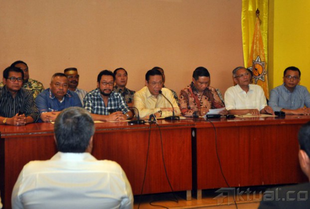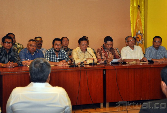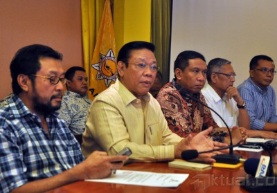 Ketua Umum Partai Golkar versi Munas IX Jakarta, Agung Laksono (tengah) memberikan keterangan kepada sejumlah awak media, di DPP Golkar, Jakarta, Selasa (24/2/2015). Dalam keterangannya, Agung Laksono mengapresiasi putusan Pengadilan Negeri Jakarta Barat yang menolak gugatan kubu rival Aburizal Bakrie (Ical). AKTUAL/JUNAIDI MAHBUB