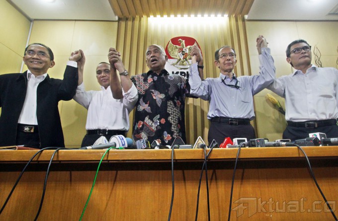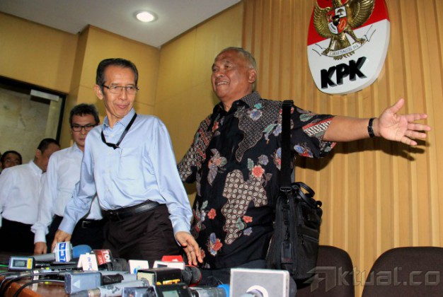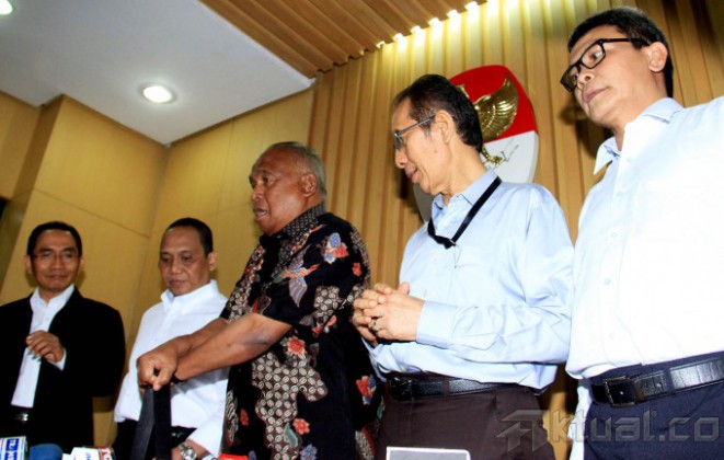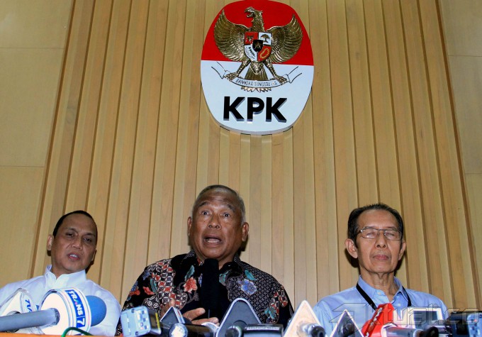 Plt Ketua KPK Taufiequrachman Ruki (kanan) didampingi Wakil Ketua KPK Zulkarnain dan Johan Budi SP saat akan memberikan keterangan usai dilantik Presiden Jokowi di KPK, Jakarta, Jumat (20/2/2015). Taufiequrachman Ruki mengatakan KPK di bawah pimpinannya akan bekerjasama dengan Polri dan Kejaksaan untuk menambah penyidik dan menyelesaikan masalah KPK vs Polri. AKTUAL/MUNZIR