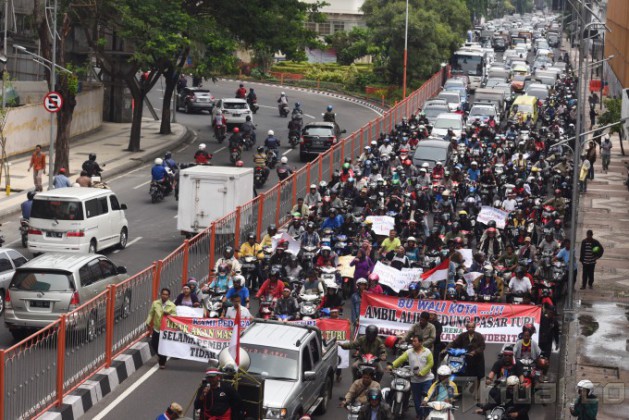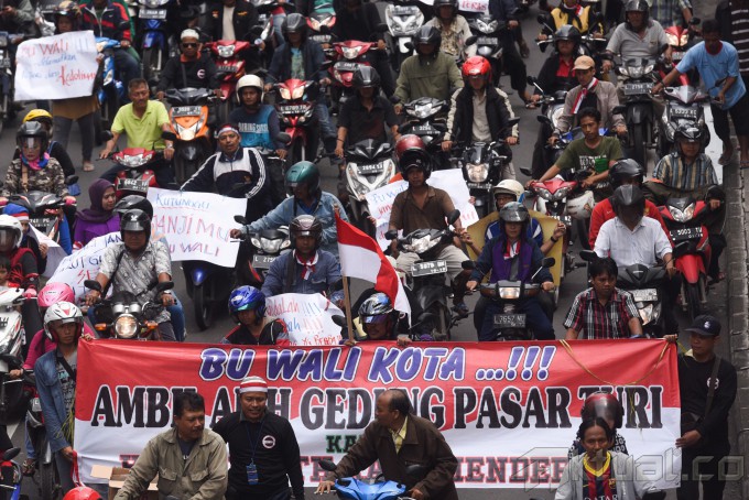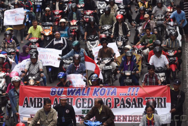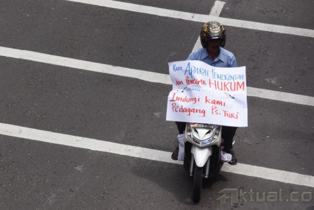 Puluhan pedagang yang tergabung dalam Gerakan Pedagang Pasar Turi Surabaya berunjuk rasa di Surabaya, Jawa Timur, Rabu (11/3). Mereka menuntut pemerintah setempat dan penegak hukum agar pasar yang diperuntukan bagi pedagang korban kebakaran 2007 lalu tidak disalahgunakan oleh oknum tertentu. ANTARA FOTO/Zabur Karuru