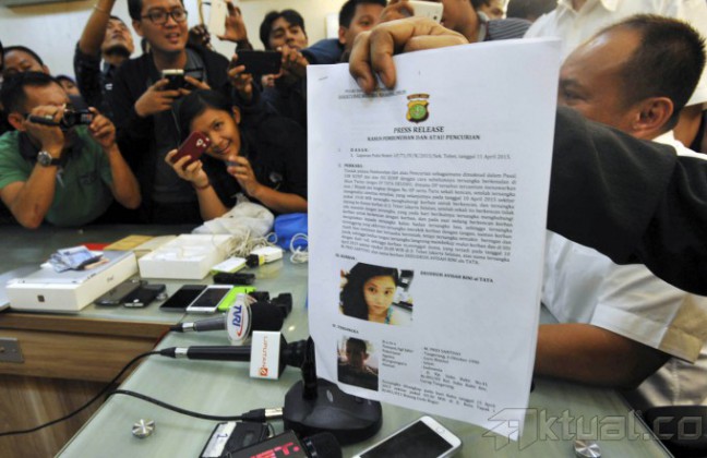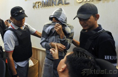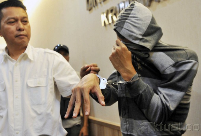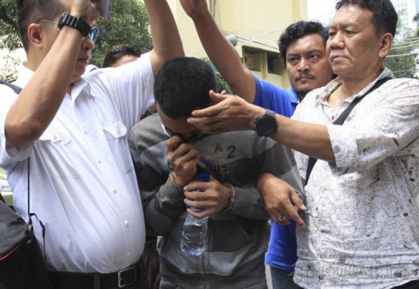 Tersangka pembunuh Deudeuh Alfisahrin (26) alias Tata alias Mpie, RS menutup kepalanya saat diperlihatkan kepada wartawan di Polda Metro Jaya, Jakarta, Rabu (15/4/2015). RS adalah pelanggan Tata yang menggunakan jasa seksnya. RS ditangkap di tempat persembunyiannya di kawasan Jonggol, Bogor, Jawa Barat. AKTUAL/TINO OKTAVIANO