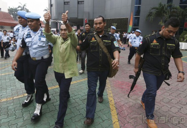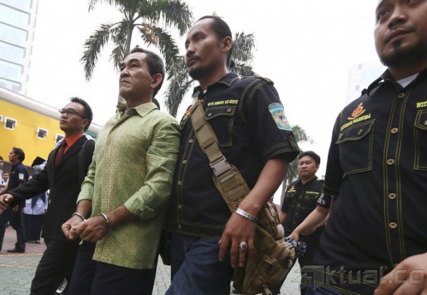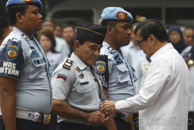 Menteri Hukum dan HAM (Menkumham) Yasonna Hamonangan Laoly melepas seragam sipir Lapas Cipinang Imron saat upacara pemecatan di kantor Kemenkumham, Jakarta (8/6/2015). Imron adalah penata muda tingkat I diketahui membantu Freddy Budiman mengedarkan narkoba di dalam lapas. Pemecatan berdasarkan Surat Keputusan Menkum HAM yang menjatuhkan hukuman disiplin berat terhadap Imron. AKTUAL/TINO OKTAVIANO