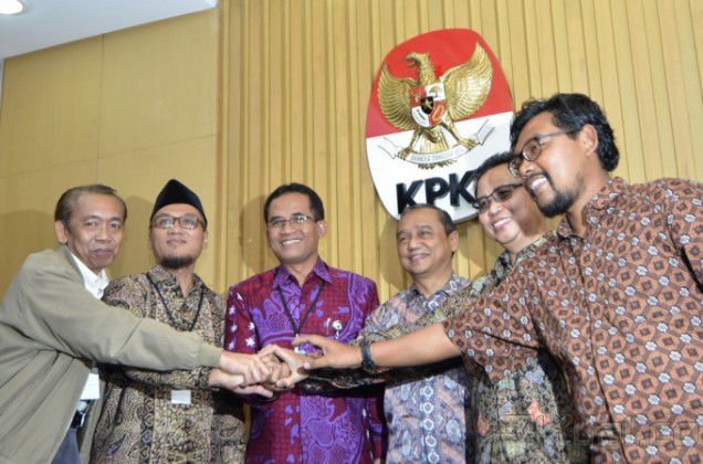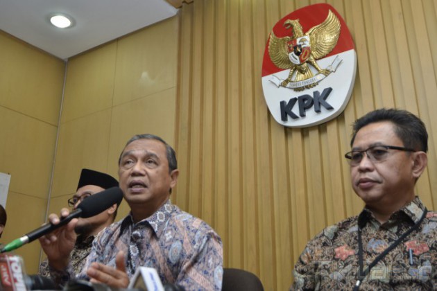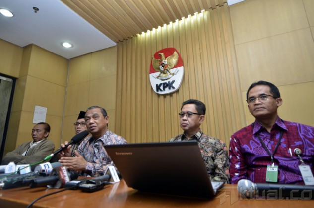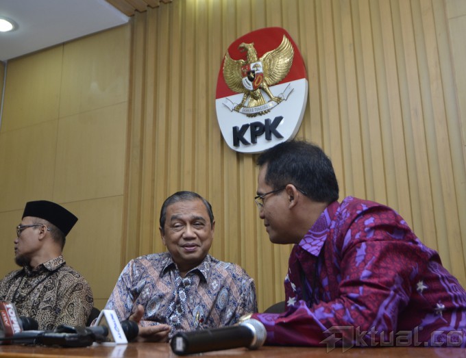 Wakil Ketua Komisi Pemberantasan Korupsi (KPK) Busyro Muqoddas (tengah) saat menyampaikan perumusan masalah penerimaan honor nikah penghulu antara KPK dan Kementerian Agama di gedung KPK, Jakarta, Rabu (18/12/2013). KPK dan Kementerian Agama telah menyepakati bahwa penerimaan honor penghulu termasuk kedalam penerimaan hadiah atau gratifikasi sesuai Pasal 12 B UU Tipikor. Aktual/Roni Kuncoro