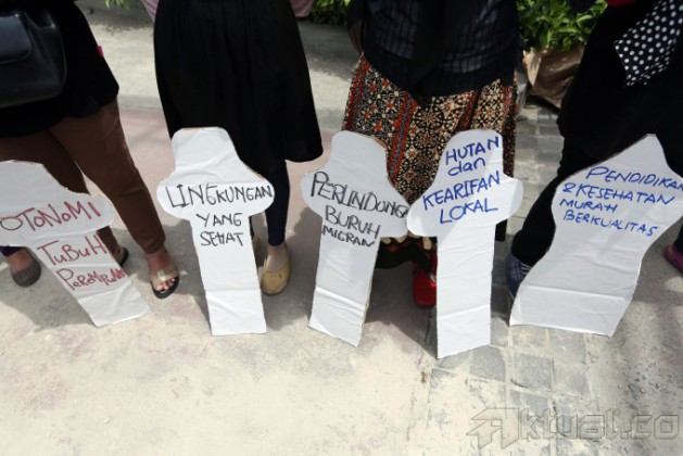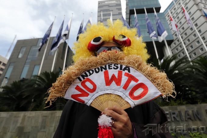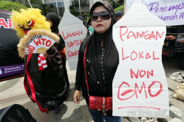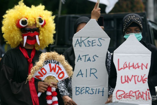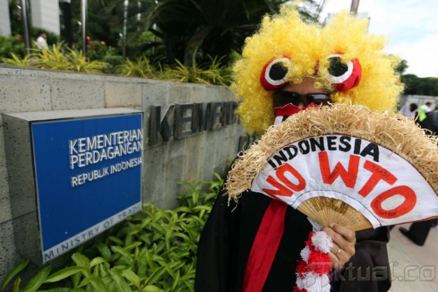 Seorang aktivis perempuan yang tergabung dalam Solidaritas Perempuan melakukan aksi minta akhiri World Trade Organitation (WTO) di depan kantor Kementerian Perdagangan, Jakarta, Rabu (20/11/2013). Aksi ini dalam rangka memperingati hari untuk penghapusan kekerasan terhadap perempuan diseluruh dunia. Salah satu bentuk nyata dari keanggotaan Indonesia dalam WTO dan perdagangan bebas, yaitu petani kehilangan lahan, dumping dan banjir impor pangan murah dan eksploitasi alam yang menguntungkan pemilik modal. Aktual/Tino Oktaviano