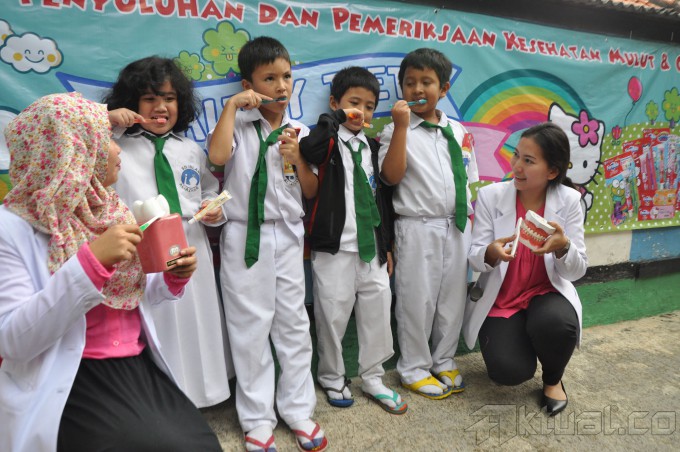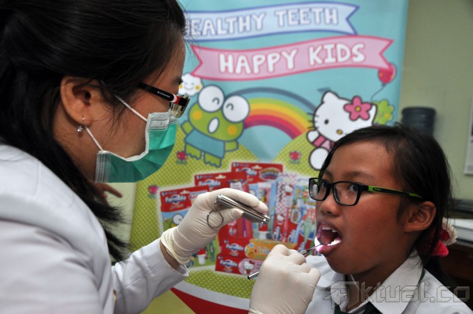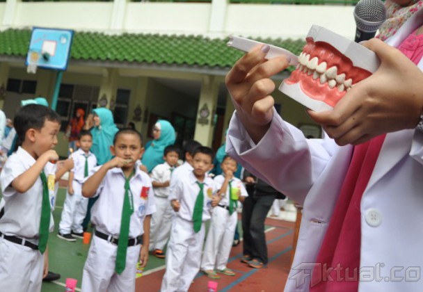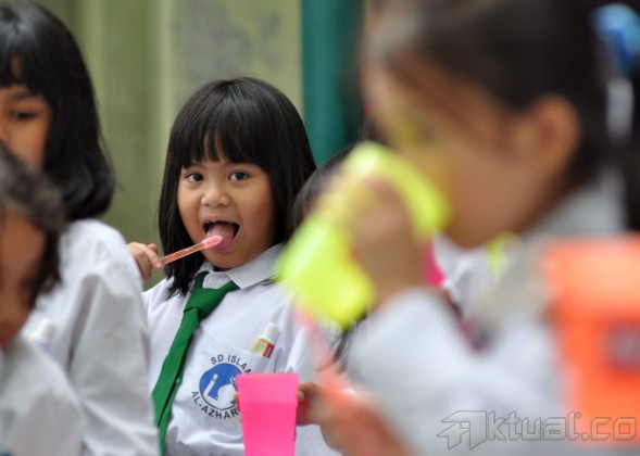 Dokter gigi melakukan edukasi cara merawat gigi dan mulut kepada siswa di Sekolah Dasar Islam Al Azhar 2, Pasar Minggu, Jakarta Selatan, Senin (9/3/2015). Rangkaian kegiatan Formula untuk Indonesia ini diadakan untuk memberikan solusi bagi setiap masalah gigi, sekaligus menciptakan gigi dan mulut masyarakat Indonesia yang sehat. Program ini rencananya akan diadakan untuk siswa kelas 1-6 di 20 Sekolah Dasar di wilayah DKI Jakarta. AKTUAL/JUNAIDI MAHBUB