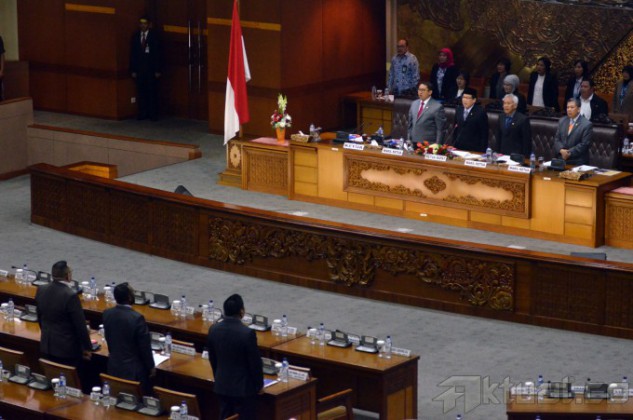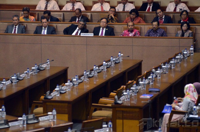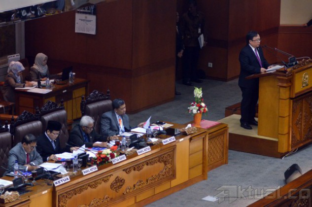 Pimpinan Sidang Paripurna Taufik Kurniawan (kedua kiri) bersalaman dengan Menteri Keuangan Bambang Brodjonegoro disaksikan Wakil Ketua DPR Fadli Zon (kiri), Ahmad Hermanto (kedua kanan) dan Fahri Hamzah di Kompleks Parlemen, Jakarta, Rabu (20/5/2015). Sidang Paripurna ke-29 tersebut beragendakan mendengar keterangan pemerintah mengenai Pokok-pokok pembicaraan pendahuluan RAPBN Tahun Anggaran 2016, laporan Tim Implementasi Reformasi DPR RI, serta penetapan struktur Tim Mekanisme Penyampaian Hak Mengusulkan dan Memperjuangkan Program Pembangunan Daerah Pemilihan (DAPIL). AKTUAL/JUNAIDI MAHBUB