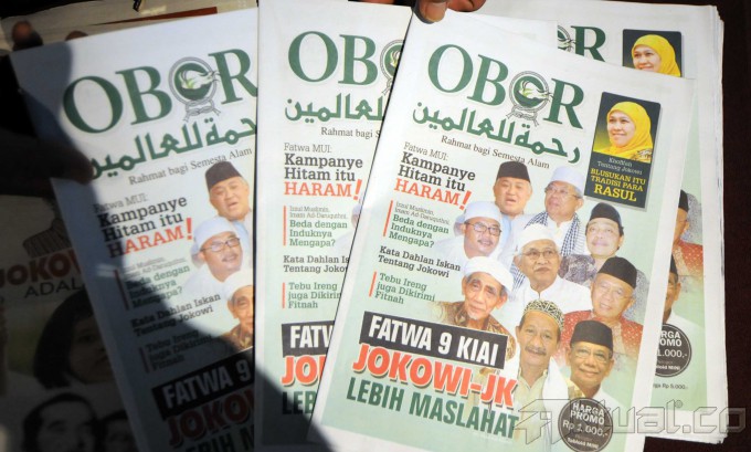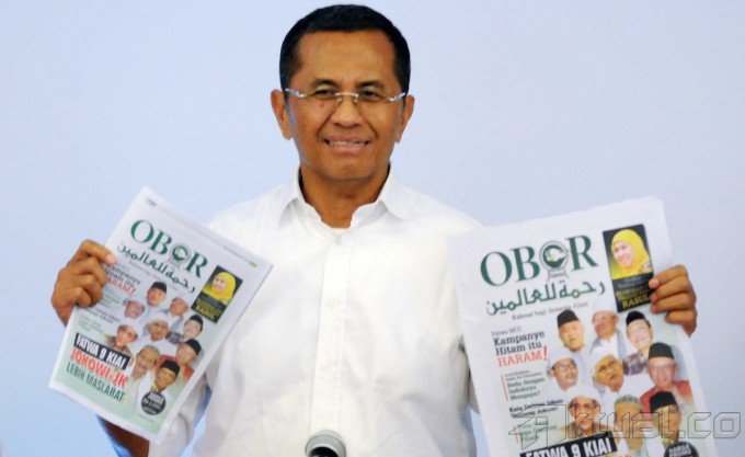 Menneg BUMN Dahlan Iskan, memperlihatkan Tabloid Obor Rahmatan Lil’alamin yang diterbitkan oleh relawan Dahlan Iskan di Jakarta, Jumat (27/6/2014). Setelah Tabloid Jokowi Adalah Kita, Buku Putih, dan sejumlah tabloid lainnya, kini giliran Tabloid Obor Rahmatan Lil’alamin yang diterbitkan. Tujuannya sama, yaitu menjawab fitnah ataupun kampanye hitam kepada Jokowi dari tabloid Obor Rakyat. Aktual/Tino Oktaviano