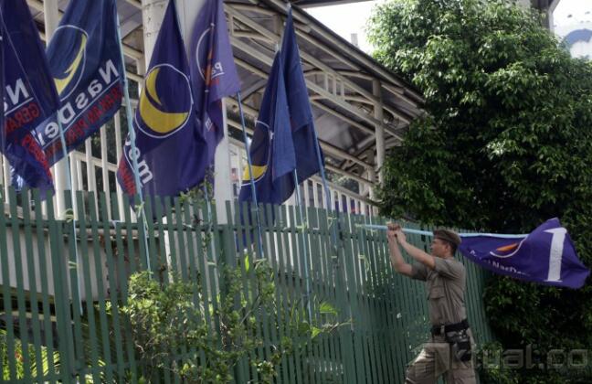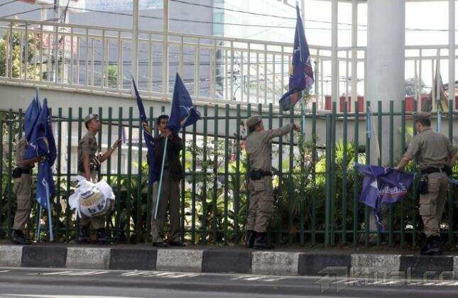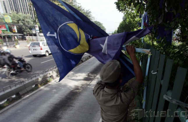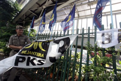 Petugas Satpol Pamong Praja melakukan penertiban terhadap alat peraga kampanye di kawasan Matraman, Jakarta Pusat (7/4/2014). Setelah masa kampanye berakhir petugas terus melakukan penertiban atribut kampanye di seluruh wilayah berkaitan dengan memasuki masa tenang. Aktual/Tino Oktaviano