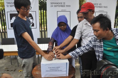 Perwakilan Mahasiswa dan Keluarga korban pelanggaran HAM memasukan koin ke dalam kotak aksi peduli di Kantor Kontras, Jl Borobudur, Jakarta, Sabtu (20/9/2014). Koin peduli untuk pembentukan Pengadilan HAM AD HOC yang digalang di kantor kontras ini akan diserahkan kepada tim transisi untuk Jokowi – JK. Sebelumnya, Presiden terpilih Joko Widodo mengatakan kepada media, Negara tidak mempunyai anggaran untuk membentuk Pengadilah HAM AD HOC. AKTUAL/JUNAIDI MAHBUB