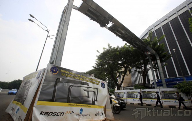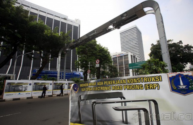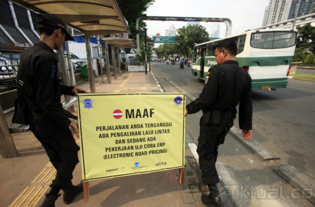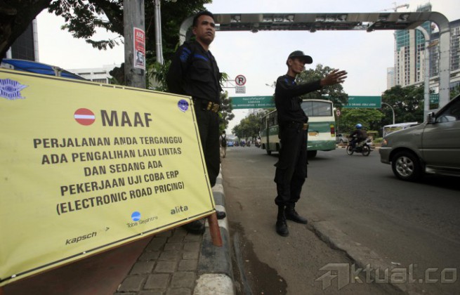 Papan proyek pengerjaan penggalian utilitas electronic road pricing (ERP) terpasang di depan Bank Panin, Jalan Sudirman, Jakarta Pusat, Jumat (4/7/2014). Pemasangan papan tersebut untuk ujicoba pelaksanaan sistem jalan berbayar atau electronic road pricing (ERP) dan nantinya akan dipasang gate sensor on board unit (OBU). Aktual/Tino Oktaviano