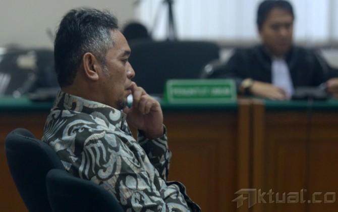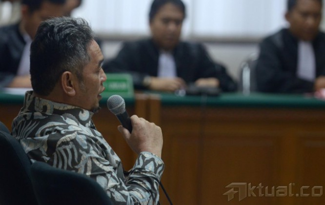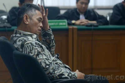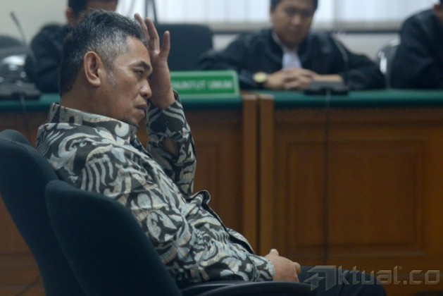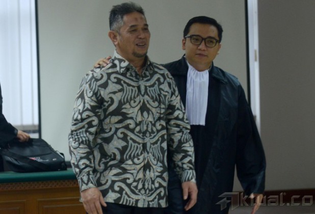 Terdakwa kasus korupsi dalam proyek pembangunan sport center di Bukit Hambalang, Jawa Barat, Teuku Bagus M. Noor, bersama kuasa hukumnya usai mendengarkan vonis majelis hakim pengadilan Tipikor di Jakarta, Selasa (8/7/2014). Mantan Kepala Divisi Konstruksi I PT Adhi Karya ini divonis empat tahun enam bulan penjara dan denda senilai Rp 150 juta. Aktual/Tino Oktaviano