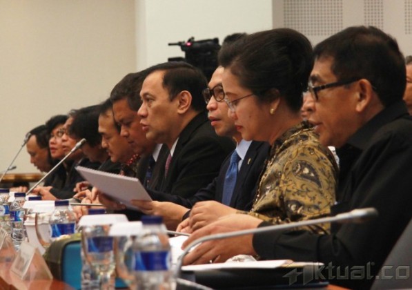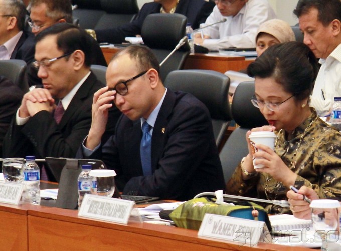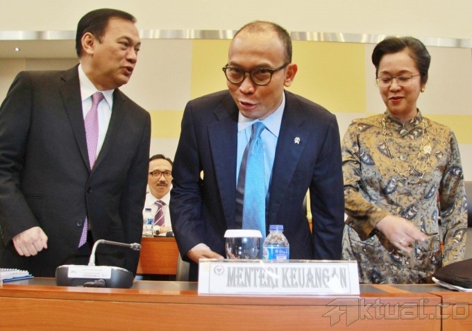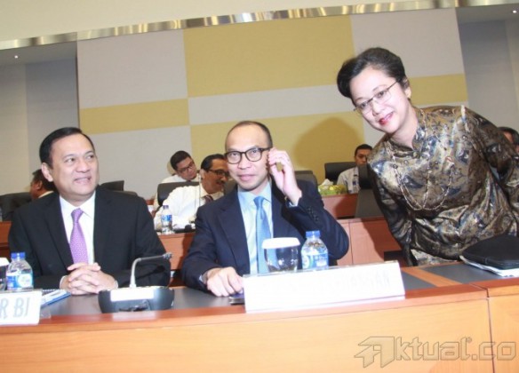 Gubernur Bank Indonesia (BI) Agus Martowardojo (kiri), bersama Menteri Keuangan Chatib Basri (tengah) dan Menteri PPN/Kepala Bappenas Armida Alisjahbana (kanan), berbincang dengan Ketua Banggar saat mengikuti rapat kerja Banggar bersama pemerintah di gedung DPR, Senayan, Jakarta, Senin (16/9/2013). Rapat membahas asumsi dasar ekonomi Rancangan Anggaran Pendapatan Belanja Negara 2014. Aktual/Tino Oktaviano
