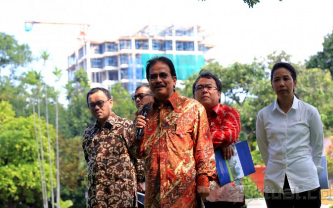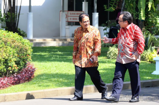 Presiden Joko Widodo (Jokowi) didampingi Menko Perekonomian Sofyan Djalil, Menteri BUMN Rini Suwandi, Menteri Keuangan Bambang Brodjonegoro, Menteri ESDM Sudirman Said dan Sekretaris Kabinet Andi Widjajanto menggelar jumpa pers terkait penurunan harga BBM di halaman Istana Merdeka, Jakarta, Jumat (16/1/2015). Harga Premium yang sebelumnya seharga Rp7,600 Per liter, turun menjadi Rp6.600 per liter. Untuk harga Solar, sebelumnya Rp7.250, menjadi Rp6.400 per liter dan berlaku pada Senin (19/1/2015) dini hari. AKTUAL/Ist