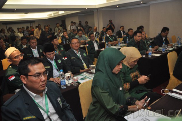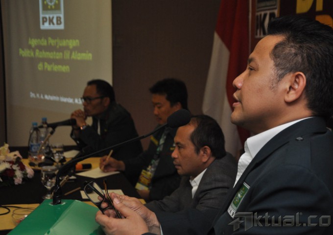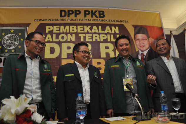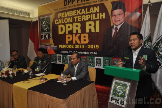 Ketua Umum PKB Muhaimin Iskandar memberikan sambutan pada acara pembekalan di Hotel Santika, Jakarta, Rabu (17/9/2014). Pembekalan diberikan kepada calon terpilih anggota DPR RI dari PKB. AKTUAL/JUNAIDI MAHBUB