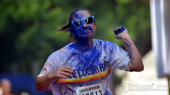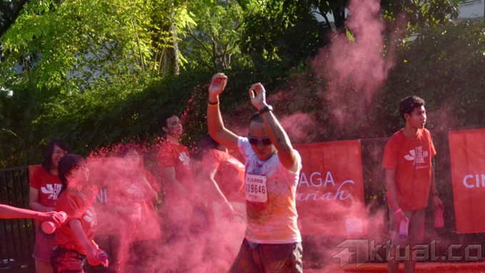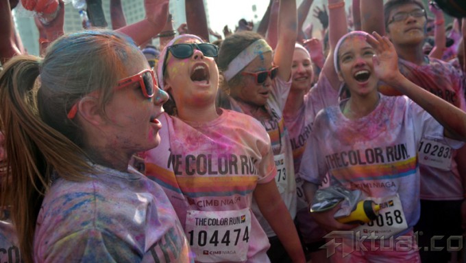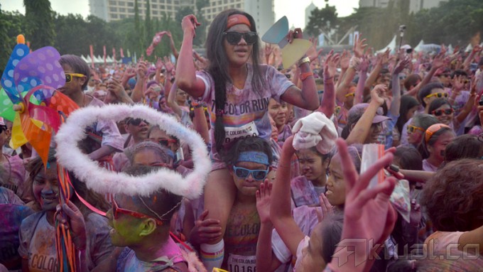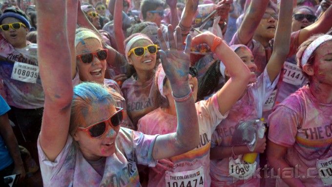 Ribuan peserta mendapat siraman bubuk berwarna saat mengikuti ajang lari “The Color Run” di Parkir Timur Gelora Bung Karno, Senayan, Jakarta, Minggu (26/1/2014). Ajang lari sejauh 5 km di sekitar Kompleks Gelora Bung Karno itu diikuti sekitar 11 ribu peserta. Lomba lari ini berasal dari Amerika Serikat yang memberikan sensasi berbeda bagi pelari dengan ditaburi warna-warni pada tubuhnya dan penuh canda tawa kebersamaan. Aktual/Tino Oktaviano