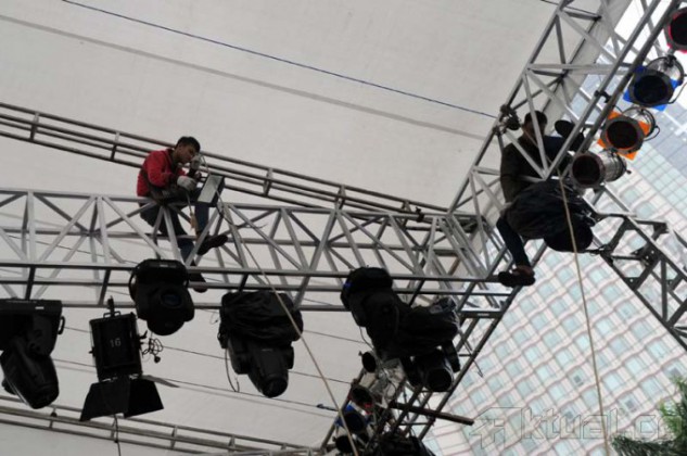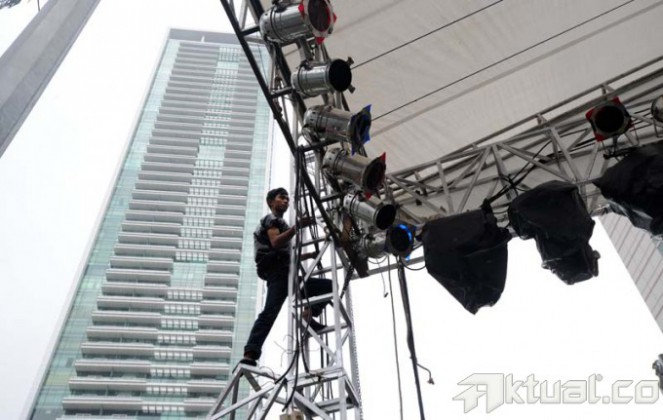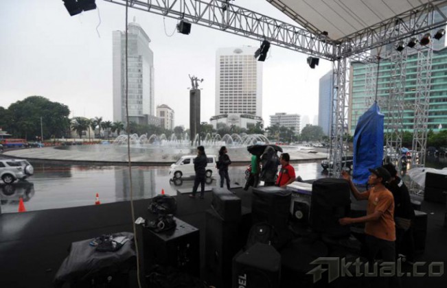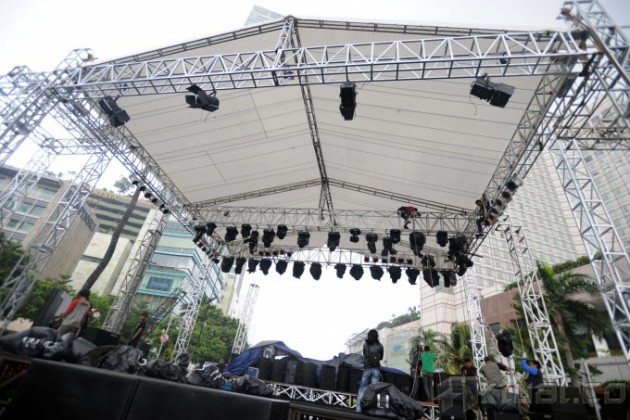 Pekerja memasang lampu pada panggung besar yang dipasang jelang Jakarta Night Festival (JNF) 2013 di kawasan Jalan MH Thamrin, Jakarta, Senin (30/12/2013). Lokasi 12 panggung hiburan JNF, antara lain di Balai Kota, Silang Barat Daya Monas, Bank Indonesia, Wisma Mandiri, Gedung Jaya, Jalan Sunda, EX Center, Hotel Pullman, Bundaran HI, Jalan Pamekasan, Gedung UOB dan Stasiun Dukuh Atas. Acara hiburan secara serentak dimulai pukul 20.00 hingga 01.30 WIB. Aktual/Tino Oktaviano