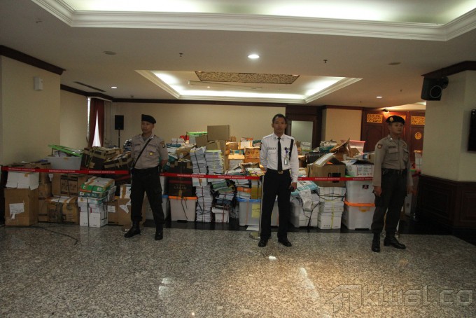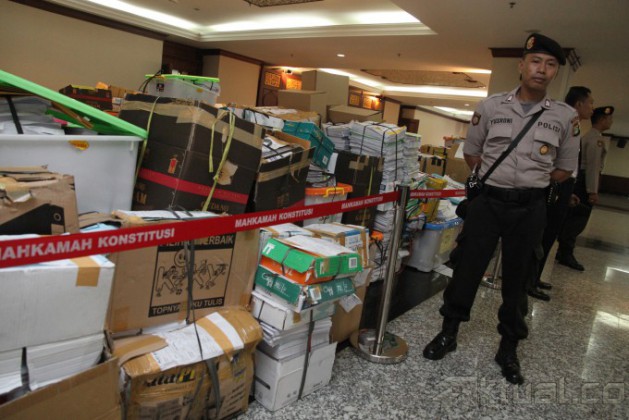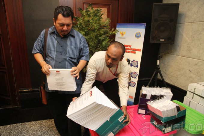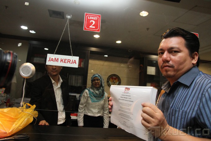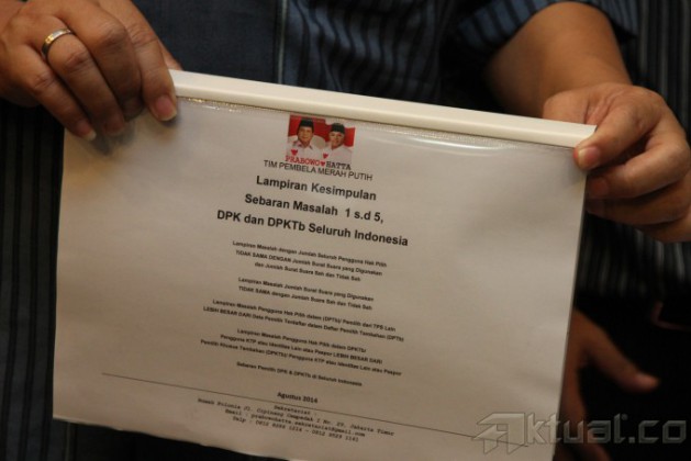 Tim advokasi pasangan Prabowo-Hatta menyerahkan berkas kelengkapan barang bukti revisi sengketa pilpres di Gedung Mahkamah Konstitusi, Jakarta, Selasa (19/8/2014). Tim advokasi menyerahkan berkas revisi perkara Perselisihan Hasil Pemilihan Umum (PHPU) serta tiga daftar bukti dan tiga bundel alat bukti yang sudah lengkapi sehingga perkara yang mereka ajukan diharapkan dapat diterima oleh Ketua MK. Aktual/Junaidi Mahbub