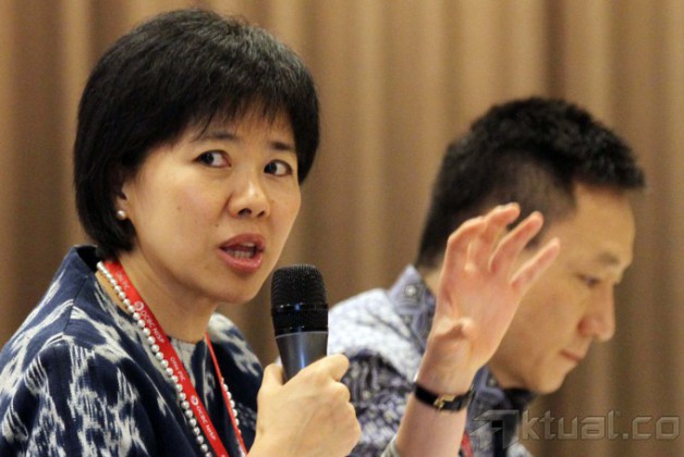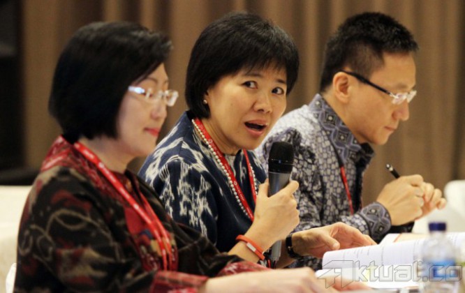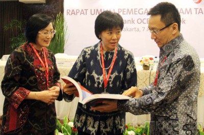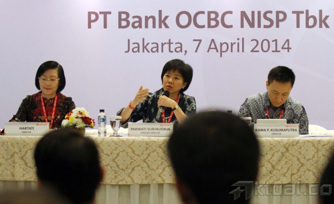 Presiden Direktur Bank OCBC NISP, Parwati Surjaudaja (tengah) didampingi para Direktur, Hartati (kiri) dan Rama P. Kusumaputra saat memberikan keterangan usai pelaksanaan RUPS Tahunan di Gedung OCBC NISP Tower, Jakarta, Senin (7/4/2014). Dalam laporan tahunan perseroan untuk tahun buku 2013, pertumbuhan kinerja yang positif terlihat dari peningkatan aset sebesar 23% dibandingkan tahun 2012 menjadi Rp 97,5 triliun. Aktual/Tino Oktaviano