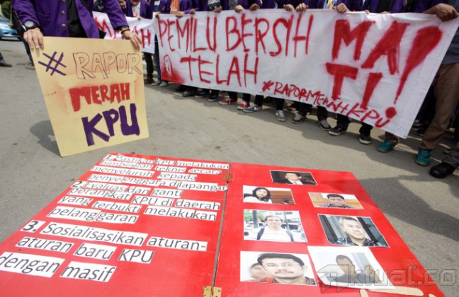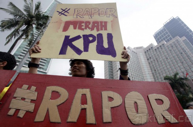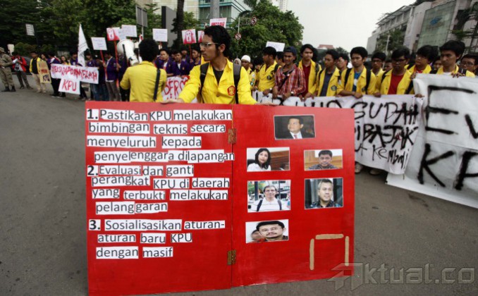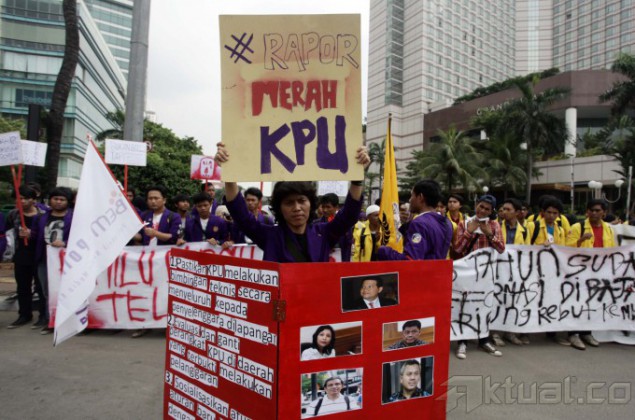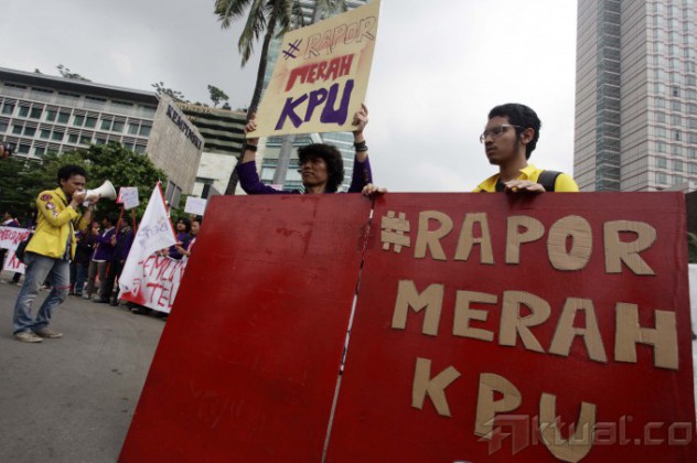 Puluhan mahasiswa dari Badan Eksekutif Mahasiswa (BEM) Seluruh Indonesia melakukan aksi raport merah Komisi Pemiluhan Umum (KPU), di Bundaran HI, Jakarta, Kamis (8/5/2014). Menurut mereka sejumlah masalah yang terjadi pada Pemilu 2014 telah menorehkan rapor merah bagi KPU. Aktual/Tino Oktaviano