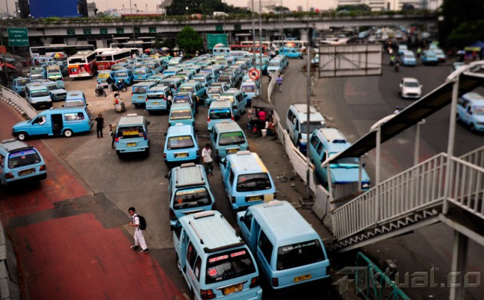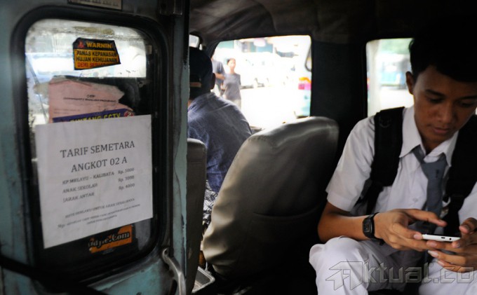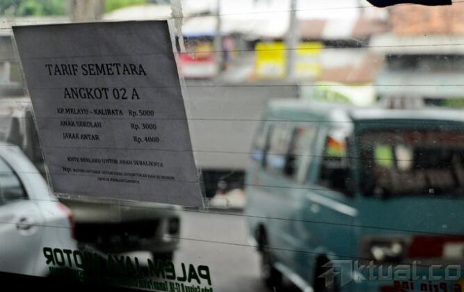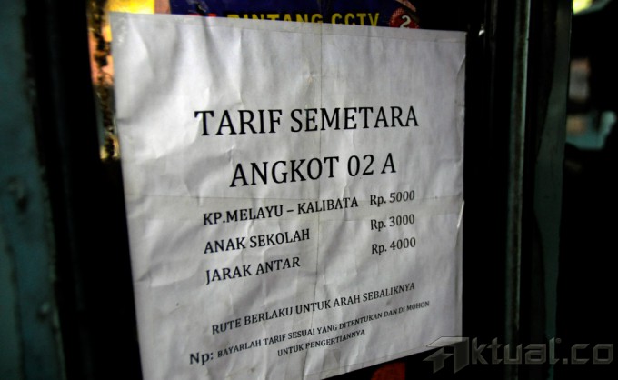 Penumpang berada disebuah angkutan kota yang terdapat pengumuman kenaikan tarif di terminal Kampung Melayu Jakarta Timur, Senin (24/11/2014). Pemprov DKI Jakarta telah menetapkan Dki Jakarta telah menetapkan tarif angkutan umum sebesar Rp 1000, karena harga BBM naik. AKTUAL/MUNZIR