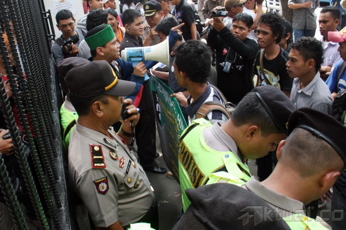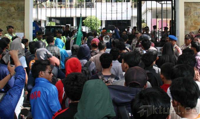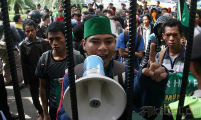 Sejumlah mahasiswa yang tergabung dalam Aliansi Kader Himpunan Mahasiswa Islam (HMI) Progresif melakukan aksi di depan gedung Komisi Pemilihan Umum (KPU) Pusat, jalan Imam Bonjol, Jakarta Pusat, Selasa (22/4/2014). Mereka meminta KPU harus bertanggung jawab dibalik kecurangan dan manipulasi dalam penyelenggaraan Pemilu 2014. Juga mendesak DPR untuk meninjau hasil kerja KPU yang cacat. Aktual/Tino Oktaviano